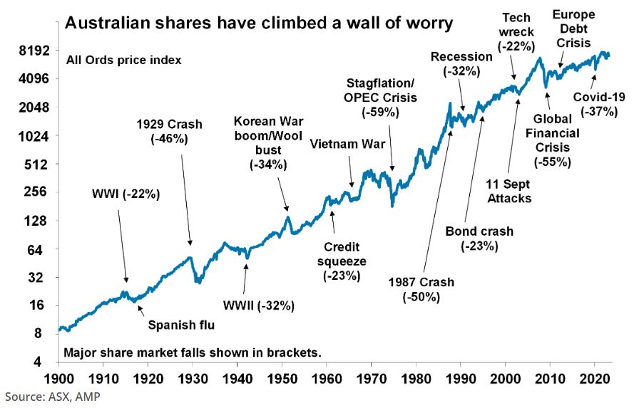 There is always something for investors to worry about it seems. And in a world where social media is competing intensely with old media it all seems more magnified and worrying. This is arguably evident again now in relation to uncertainty about inflation, interest rates and associated recessions risks. The global economy has had plenty of worries over the last century, but it got over them with Australian shares returning 11.7% per annum since 1900, with a broad rising trend in the All Ords price index as can be seen in the next chart, and US shares returning 9.9% pa. (Note that this chart shows the All Ords share price index whereas the first chart shows the value of $1 invested in the All Ords accumulation index, which allows for changes in share prices and dividends.)