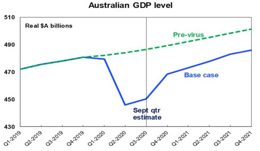 Our forecasts for the level of real Australian GDP are shown in the next chart. Note that while a return to growth in the September quarter will mean that technically the recession is over, this really is just a technicality because the level of activity will still be a long way below its pre-coronavirus level.