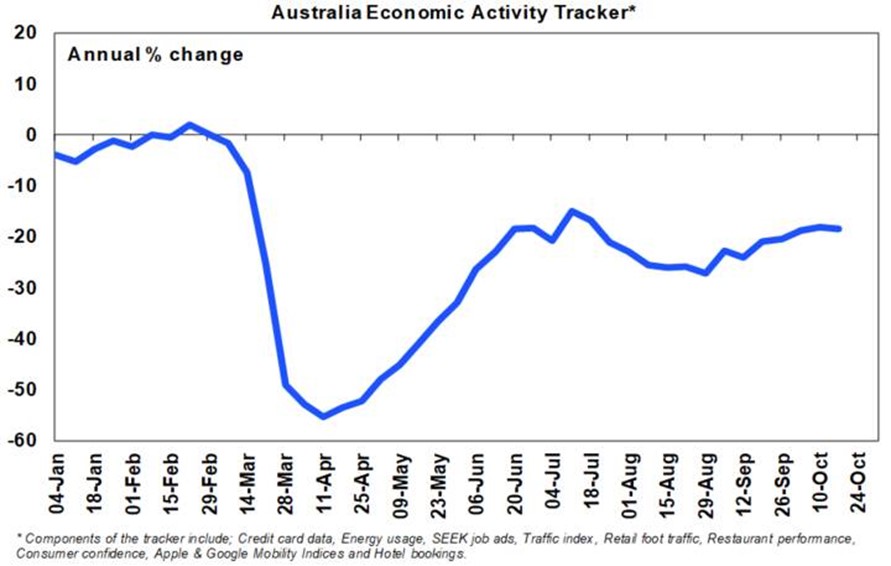 This clearly shows the initial hard decline in the economy into mid-April, followed by a strong bounce into July on reopening. The recovery then faltered a bit and now seems to be getting back on track with Victoria reopening.