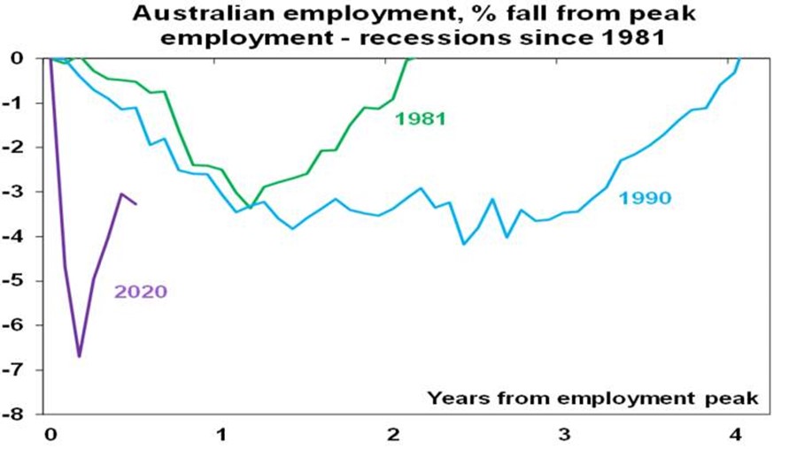 A sharp hit followed by an initial “deep V” rebound can also be seen in Australian employment, which has now recovered about half the job losses seen in April and May.