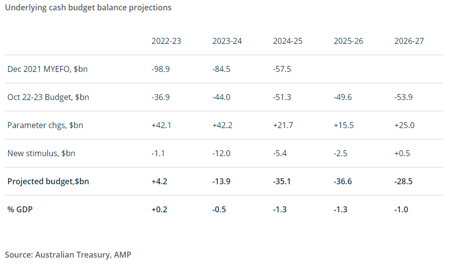 This Budget like all of those since 2020 has benefitted from huge revenue flows coming from a combination of higher personal tax collections due to stronger jobs and wages growth, higher commodity prices and higher non mining profits than assumed. It looks like “rivers of gold” flowing to Canberra but it’s really good luck flowing from conservative forecasts regarding jobs, wages, inflation and commodity prices. This windfall (see the line called “parameter changes” in the next table) is estimated to reduce the deficit this financial year by $42b compared to last October’s forecast, with carry over to next year before slowing as unemployment rises. Some of the windfall has been spent (see the line called “new stimulus”) but 86% of it out to 2026-27 has been saved. As a result, the budget is now projected to be in surplus for this year – its first since 2007-08, a massive turnaround from the $99b deficit projected less than 18 months ago and the fastest improvement as a share of GDP since the end of WW2 when the deficit went from 10.5% of GDP in 1944-45 to 0.8% in 1946-47. While there is net new stimulus going forward (mainly in 2024-25) due to the cost of living measures it turns negative by 2026-27 (as Budget savings kick in) and over the next four years is swamped by the revenue windfall resulting in lower budget deficits going forward.
