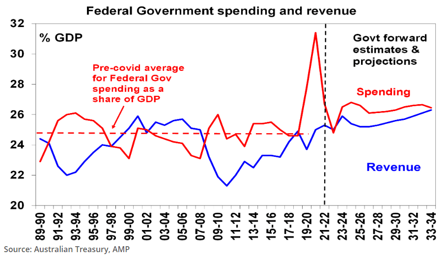Projections for spending as a share of GDP remain above the pre-COVID average of 24.8% but are lower than previously, with Budget measures restricting spending growth to 0.6%pa out to 2026-27. Revenue trends higher (partly due to tax measures in the Budget) as a share of GDP reaching its 1986-87 record of 26.2% in a decade.
