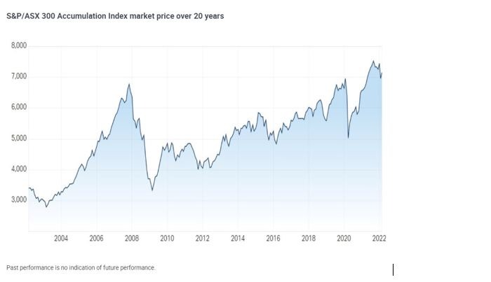 History has shown us that even though share markets fluctuate regularly, the general trend is always upwards over the long term. For example, the S&P/ASX 300 Accumulation Index, which tracks the performance of the largest 300 companies on the Australian stock market, increased from 4,052 on 30 December 2011 (the last trading day of that year) to 7,453 on 31 December 2021, despite a lot of bumps along the way. When you add in the return of dividends paid over that period, that’s a total return of 184%.